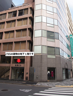 「昭和通り」(首都高速の下を走る通り)と「靖国通り」の交差点近くにある「千葉銀行」の角を左手に曲がり、1本目の道(大門通り)の角にある赤茶色の建物「花岡ビル」の地下1階。