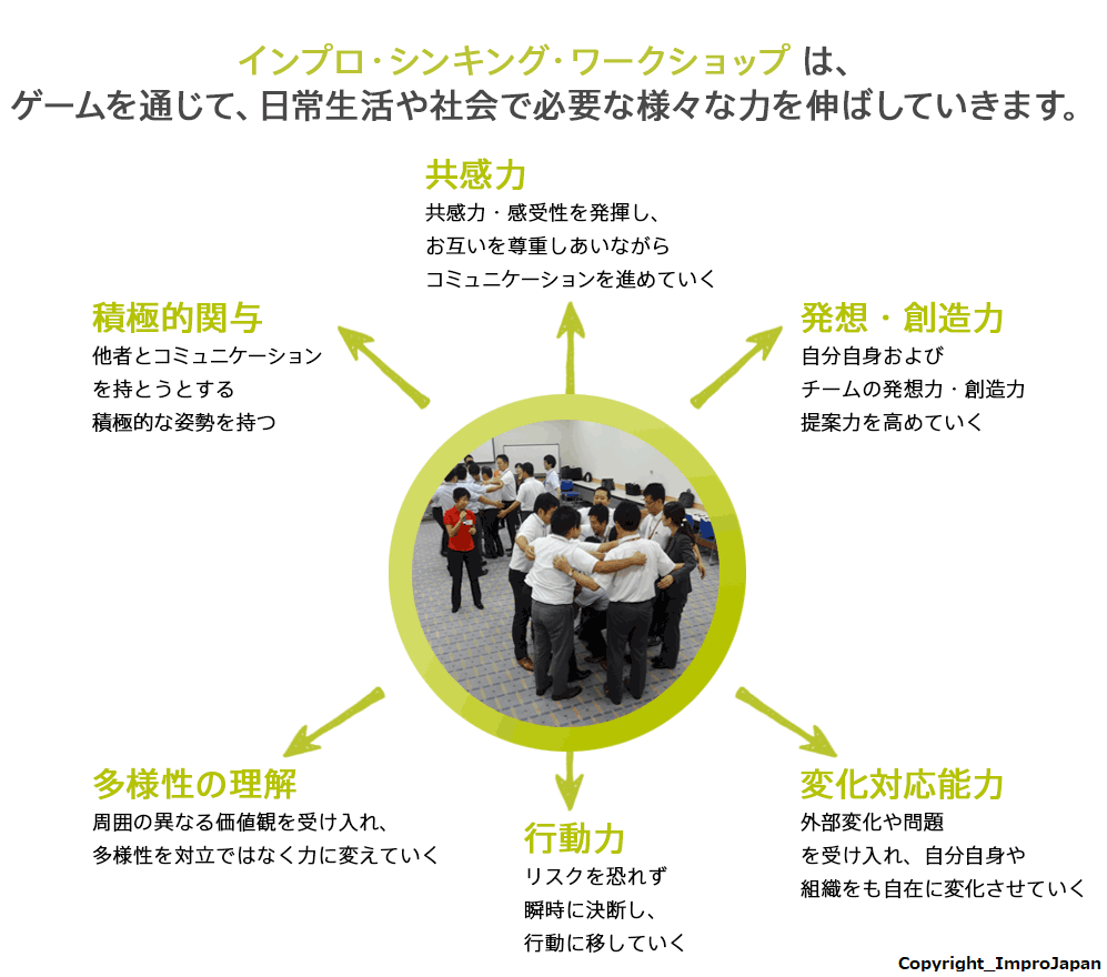 あらゆる瞬間に集中し、その場に起こった出来事、相手の言葉や感情等を瞬時に感じ取り、見極め、即座に対応していくのが即興力です。インプロのゲームを通じて、ビジネスの現場での変化にも即興力を発揮し、自らの判断で、素早く対応できるようになっていきます。