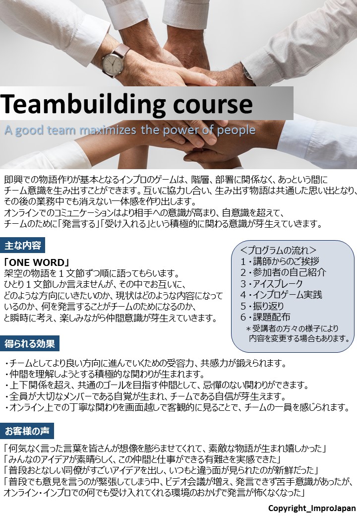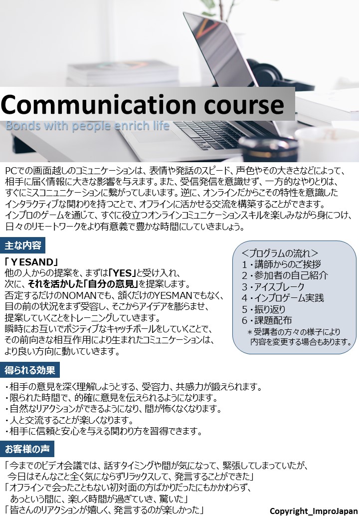 インプロジャパンでは、このような声にお答えして、今こそ必要なコミュニケーション力を、オンラインで鍛えられる