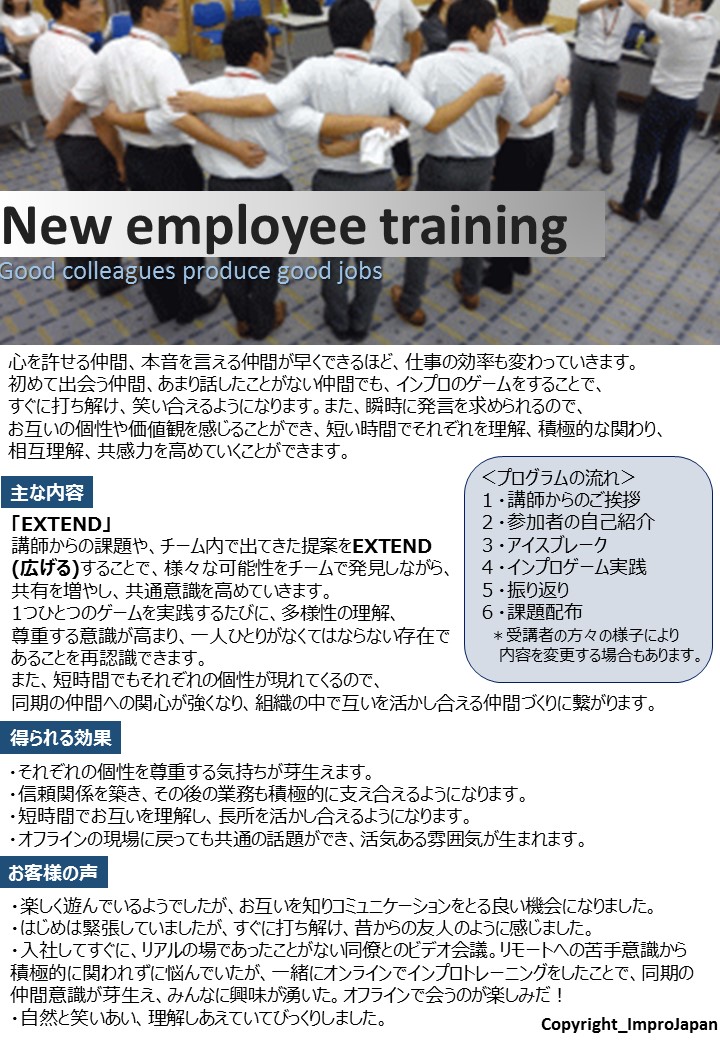 *その他、「自宅での始業前のアイスブレイクインプロ」、「オンラインだからできる伝える力を学ぶ」、「リモートワークでの表現力、プレゼン力強化」等、
