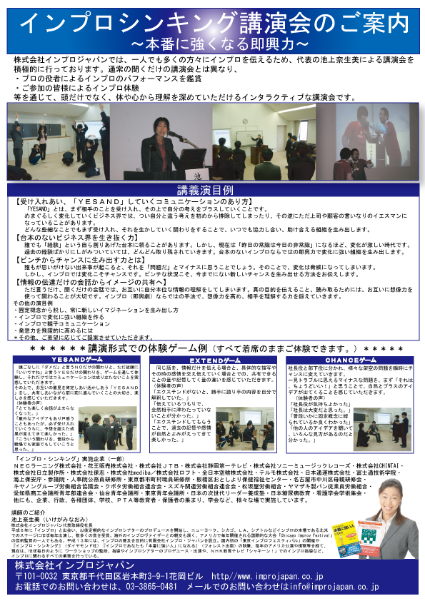 代表の池上奈生美による「インプロ・シンキング講演会」のご依頼も承っております。