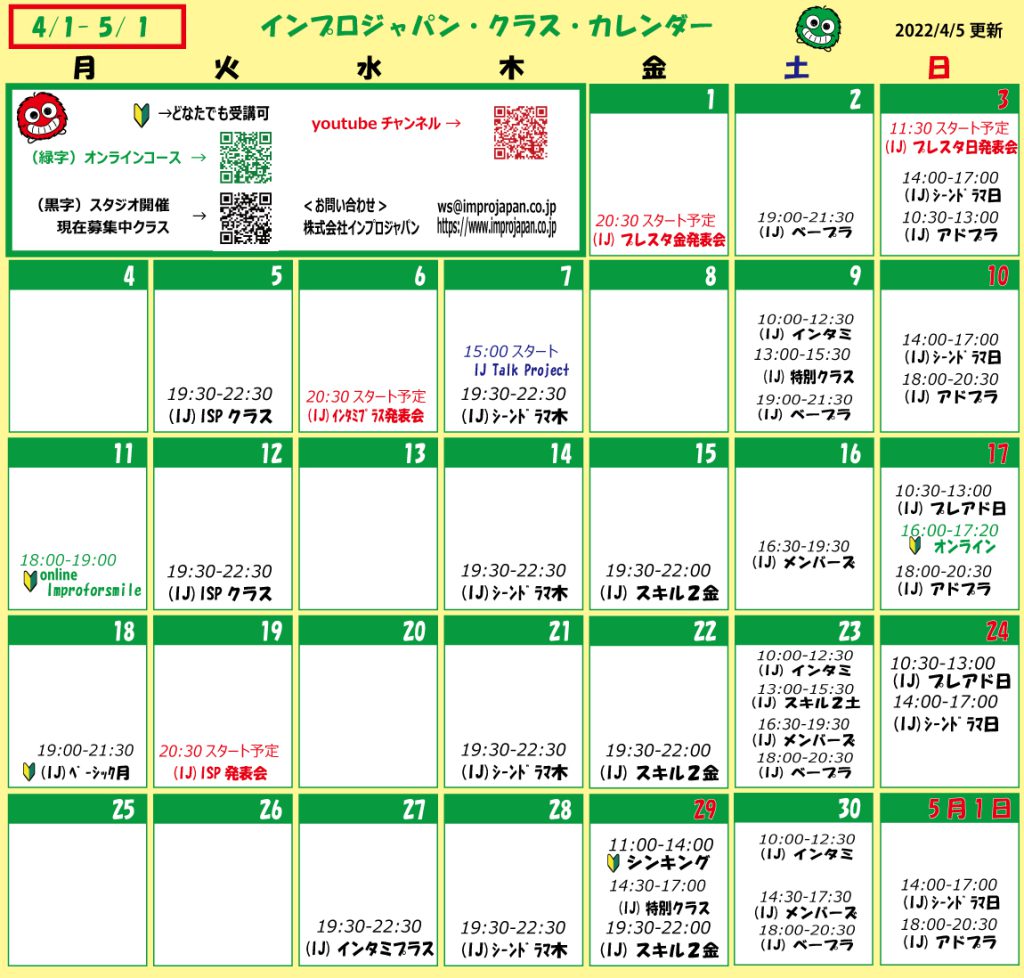 2022年4月クラスカレンダー更新