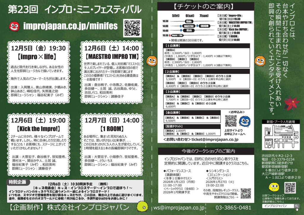 インプロジャパンメンバーによるインプロの劇場公演。 公演日ごとの演目も代わり、いろいろなスタイルのインプロ・ショーをお楽しみ頂けます。インプロ・ミニ・フェスティバルは、2002年12月に第1回を開催して以来、現在活躍中の数多くのインプロ・パフォーマーを輩出してきました。