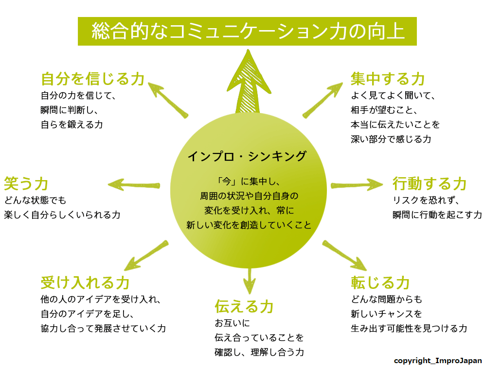 職場や学校等、日常生活の中で活かせる総合的なコミュニケーションスキル(変化対応力・多様性の理解・発想力・想像力・行動力・表現力・創造力・共感力・受容力など)を、インプロのゲームを通じて伸ばしてきます。楽しみ、関わり合いながら、自然と自分力が高まり、内面から変化していきます。